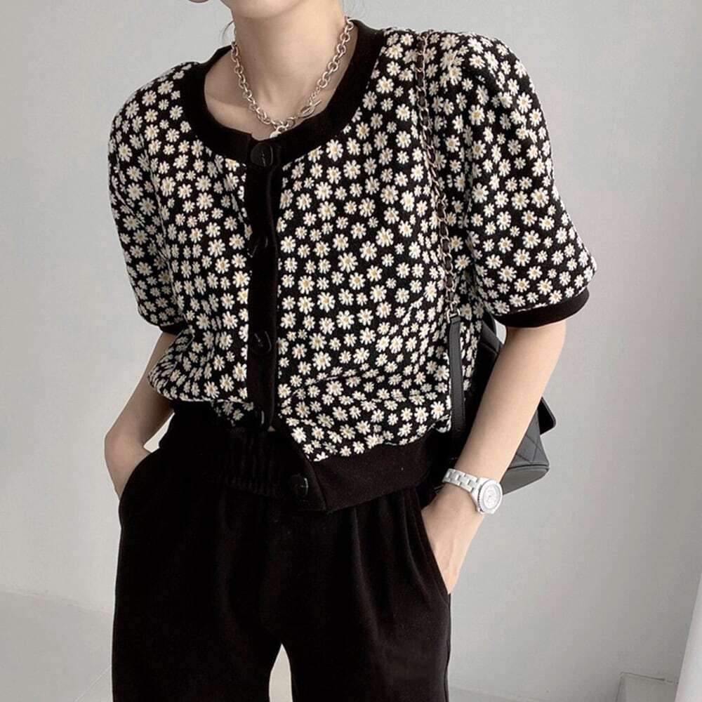 女性らしいメリハリボディに見せてくれる、デイジーの花柄がおしゃれで可愛いポイントのニットトップス